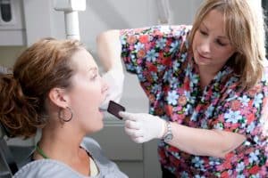 Dental Hygienist Taking X-Rays for Woman at Dentist Office